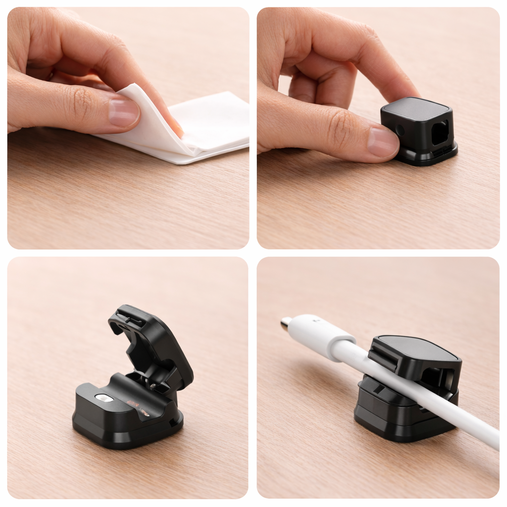Install in seconds for clean, everyday cable management. Peel and stick the base, then snap in charging cables, power cords, HDMI cables, and more — keeping everything secure and within reach.